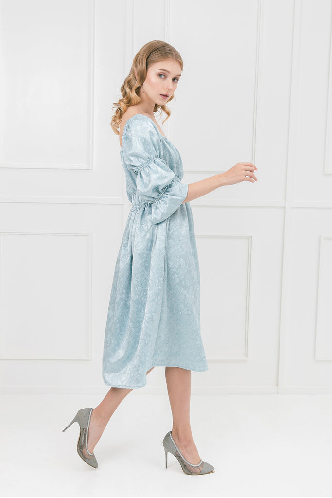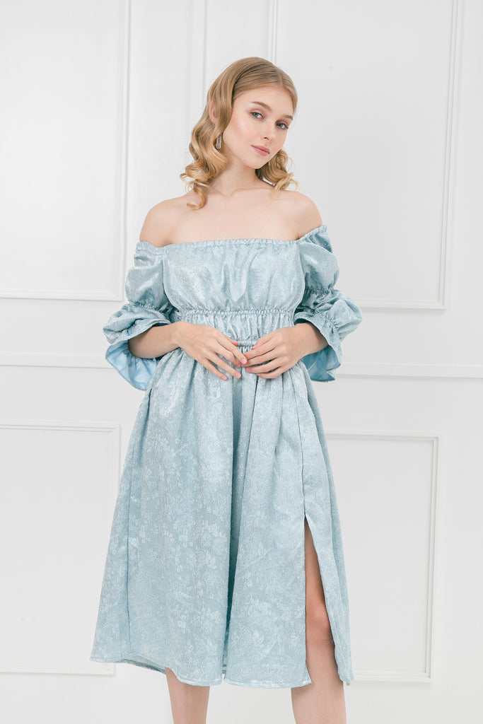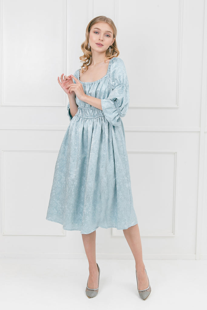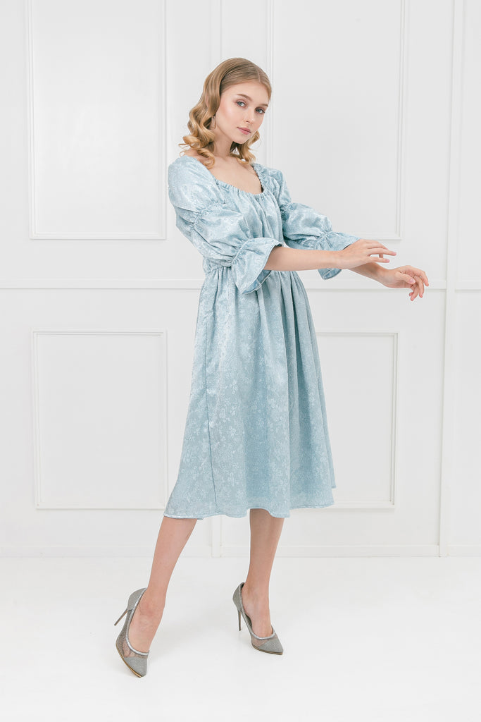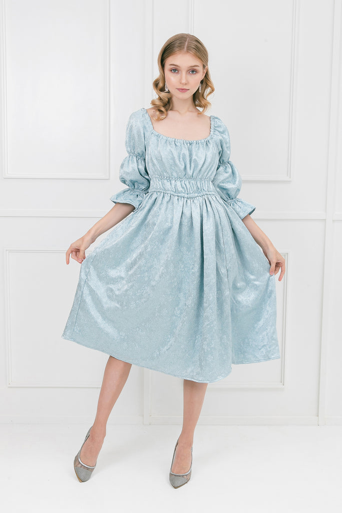 Romantic puffed sleeves beauty made out of the dreamiest jacquard glitter fabric. Fully-lined with cotton fabric and featuring smocked bodice, elasticated neckline, and slit on side, this dress is simply a show-stopping, whimsical dream. Dance in the garden or be swept away to the castles with this dress.