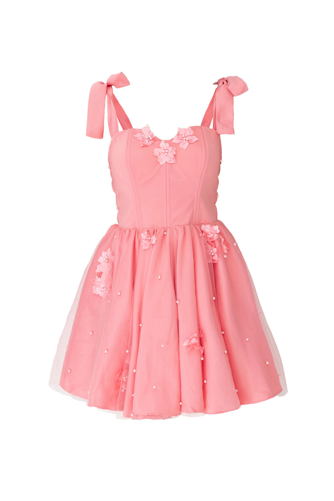 Look like the sugarplum fairy herself in this fanciful dress embellished with pearls and flower petals. The dreamy ribbon straps along with the delicate pleated skirt give a romantic feel. The corseted bodice will gently sculpt your figure. Twirl and dance in the gardens with the enchanting Sugarplum Dress.