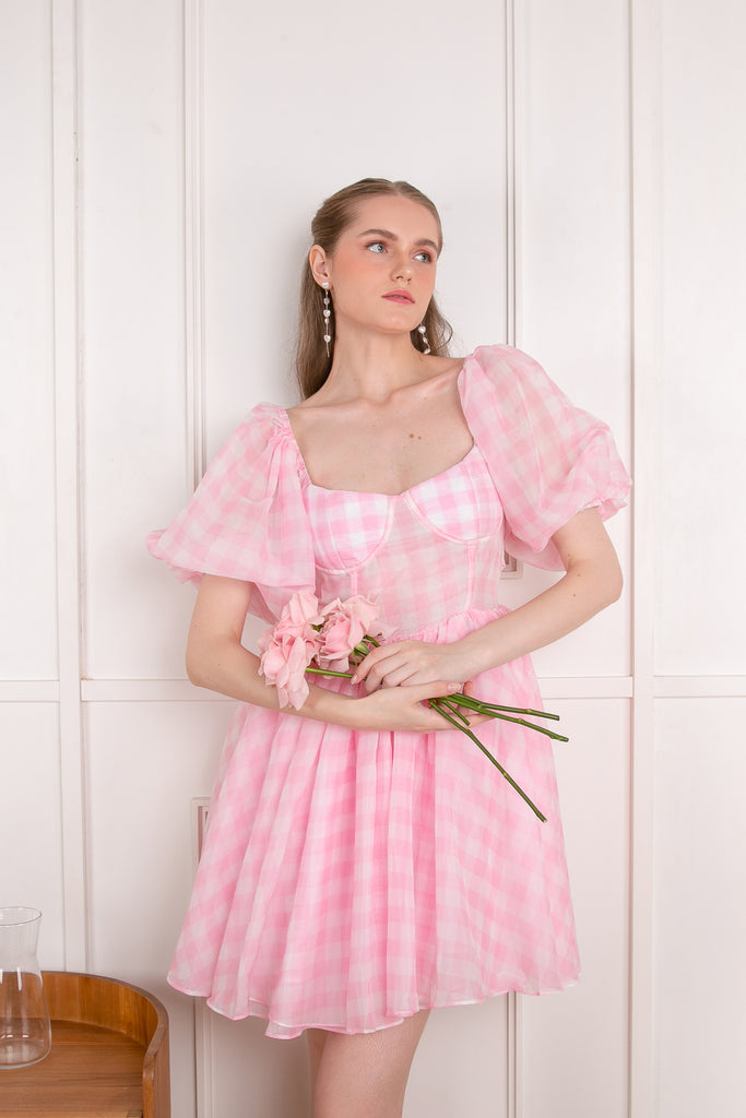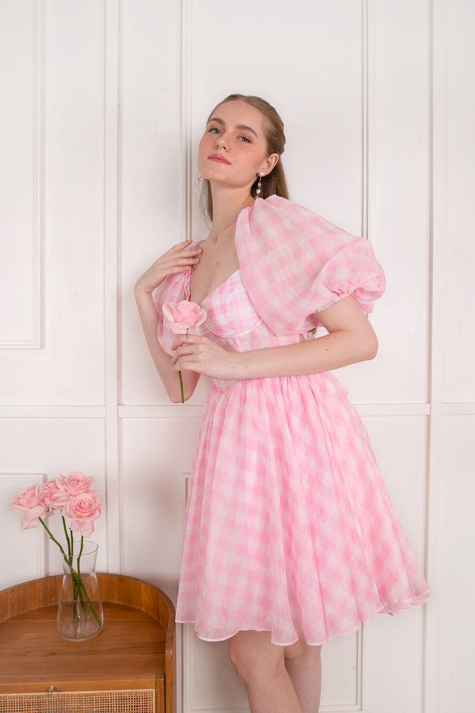 Twirl and pirouette in the Dollhouse Dress, a dreamy piece that will make you feel like a princess. Inspired by the joys of childhood, this dress is crafted from the softest organza fabric that feels as delicate as a rose petal against your skin. Adorned with statement back ribbons and puffed sleeves, it exudes an air of sweet fairytale dreams. The charming gingham print makes it a timeless piece for your wardrobe. Whether it's for a tea party or a stroll through the garden, the Dollhouse Dress is the perfect companion for a day filled with sweet memories.